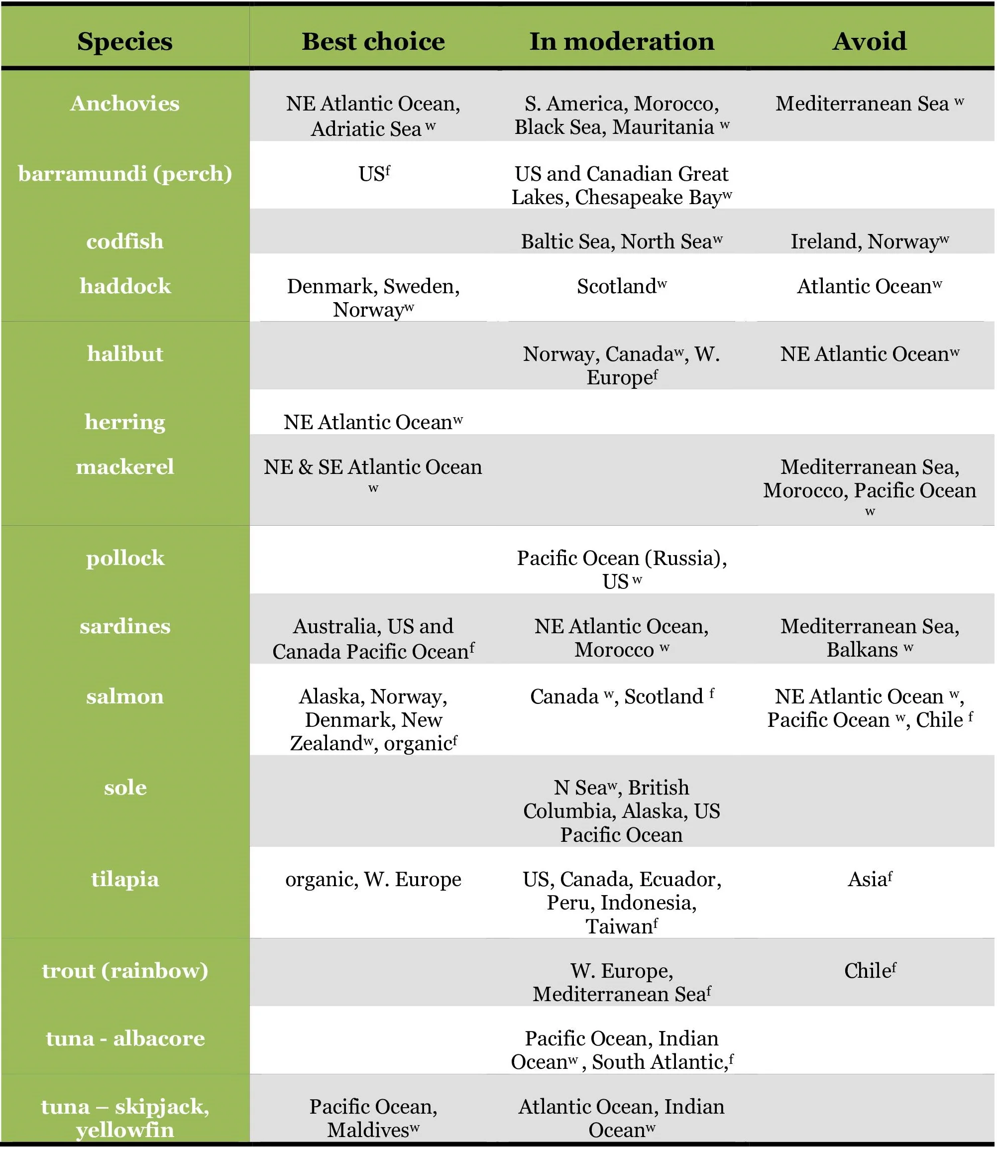 w = wild caught f = farmed
