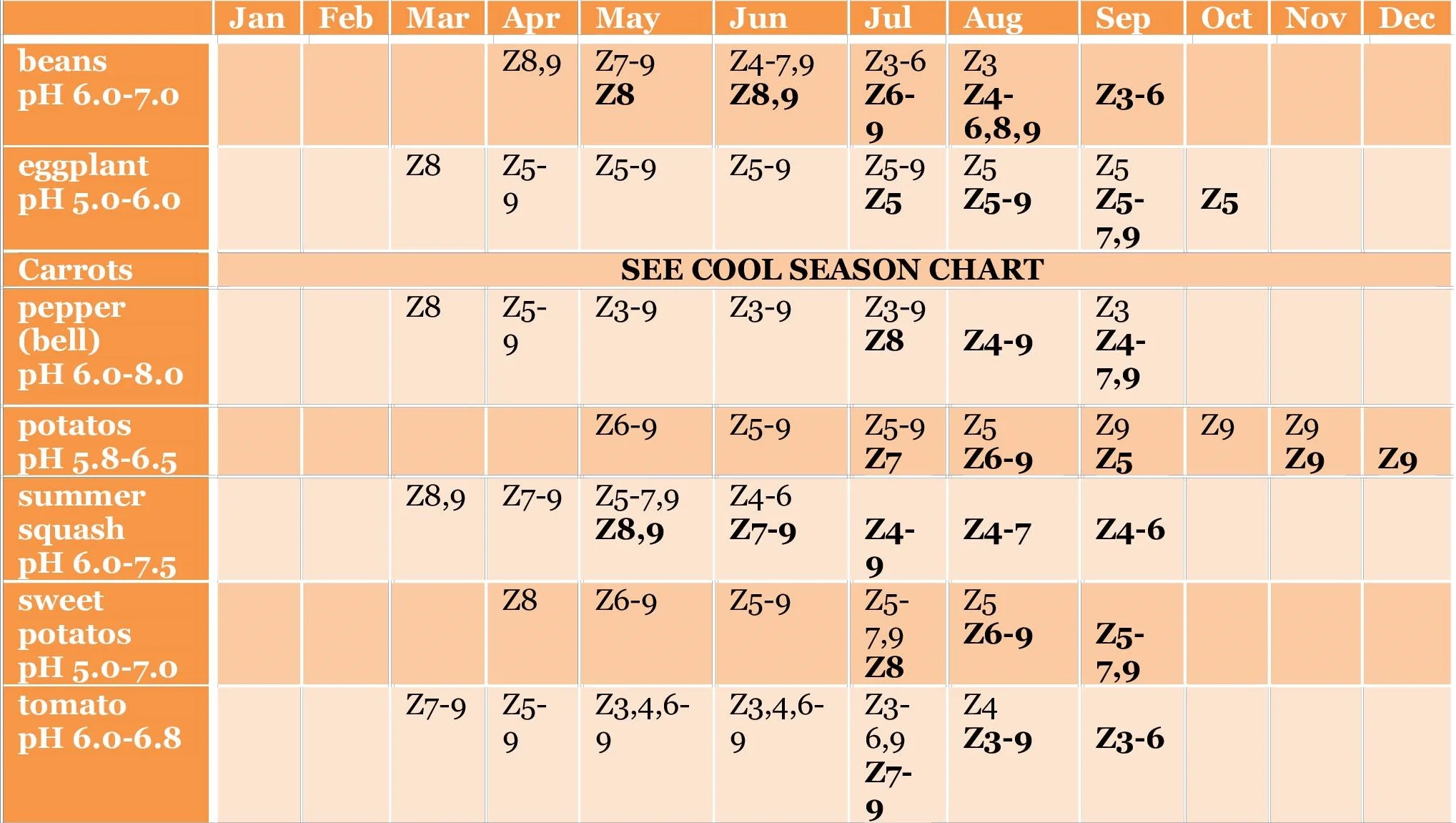 sow/transplant seeds: Z= Zone (normal); harvest: Z= Zone (bold); ideal soil Ph levels for optimal growth
